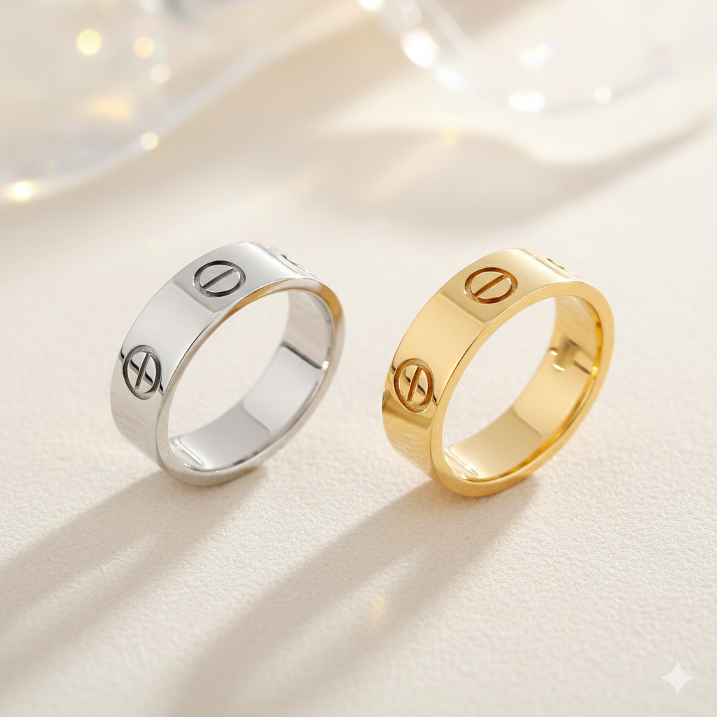 Este anillo suele estar hecho de materiales de alta calidad, como acero inoxidable , y está diseñado para imitar la apariencia del original de Cartier a un precio más asequible. Es una opción popular para quienes desean lucir un aspecto elegante y sofisticado sin gastar tanto como en la versión original de Cartier.