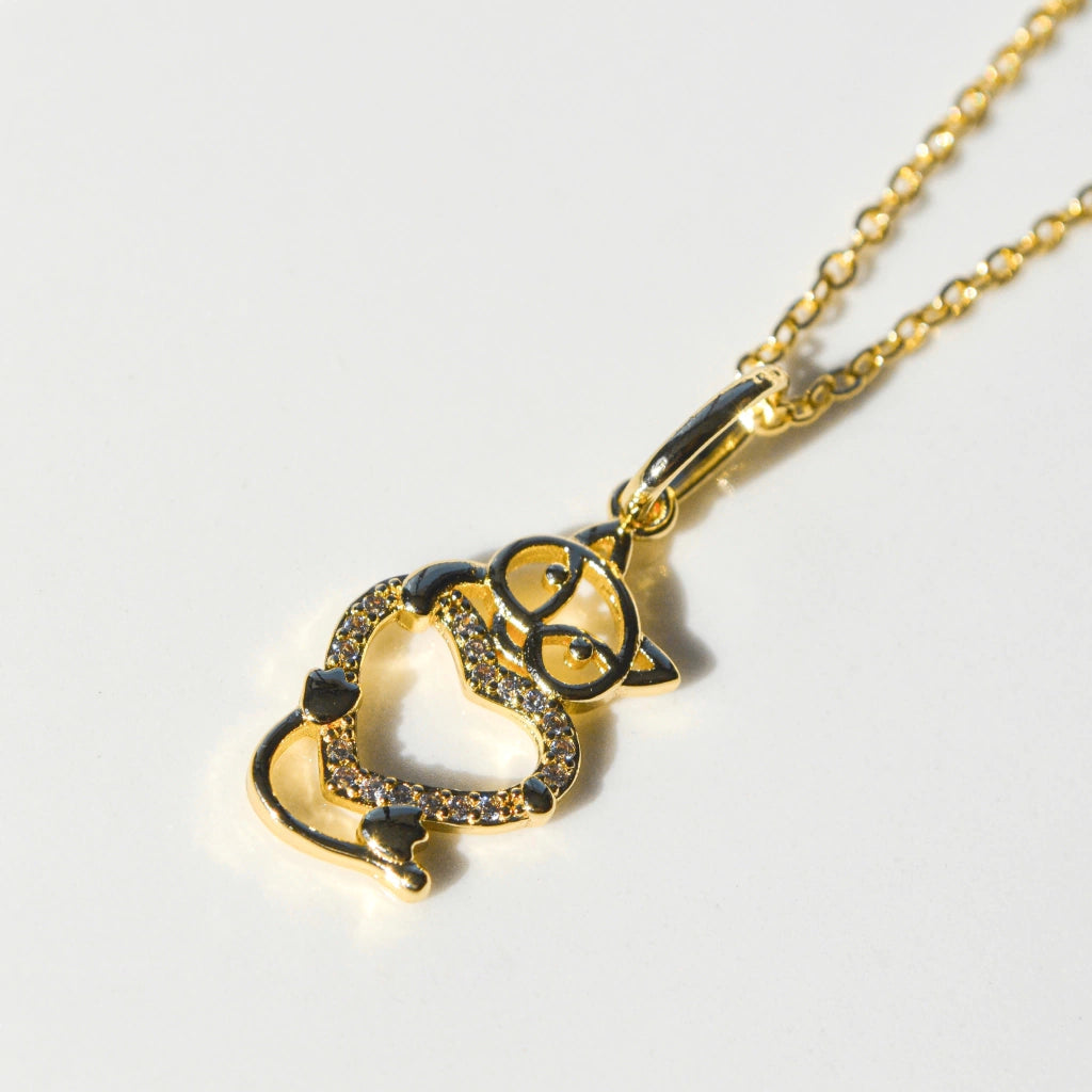 Con un colgante en forma de gato y un corazón entrelazados, este collar es perfecto para los amantes de los felinos que también quieren expresar su cariño.