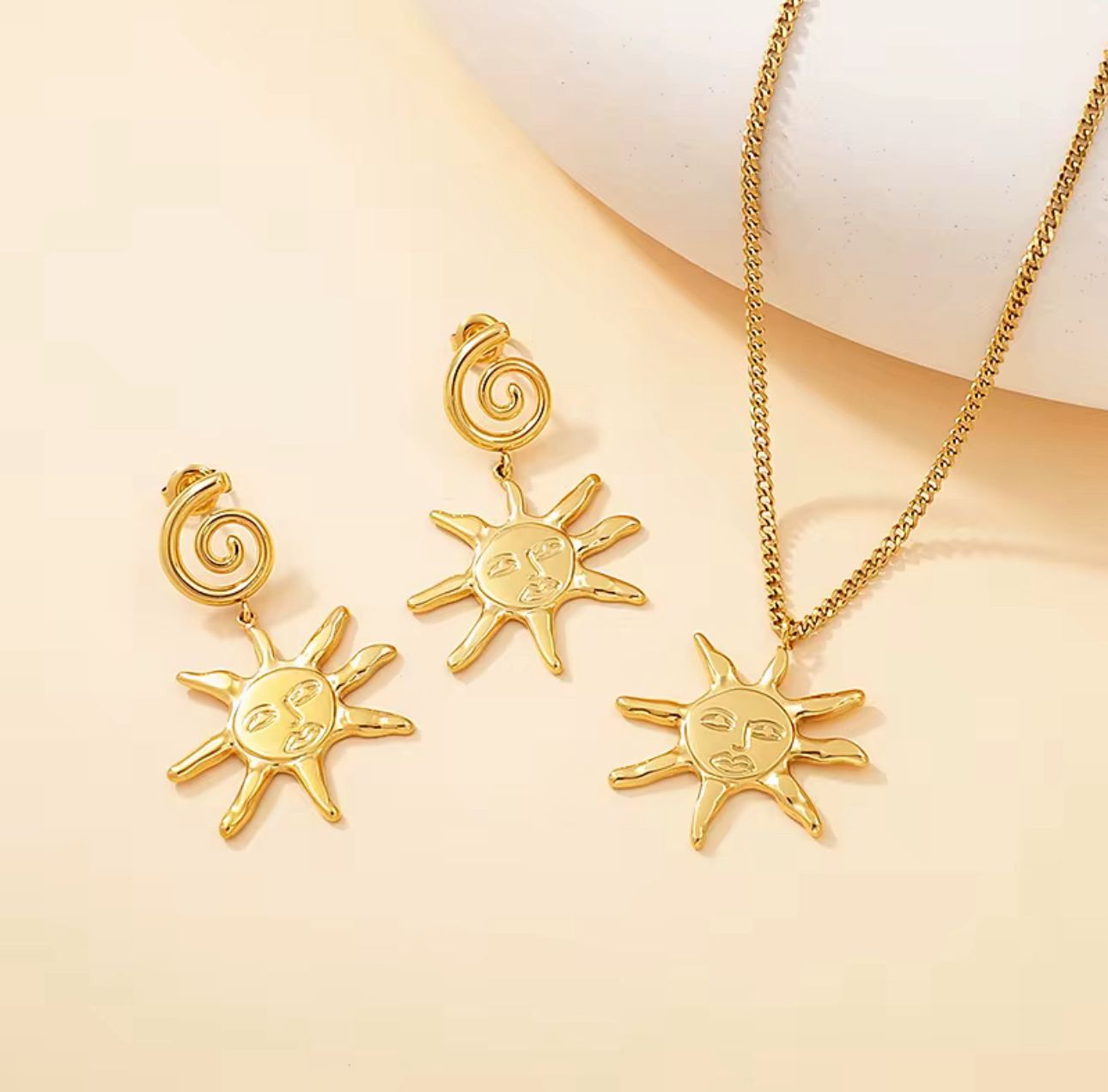 Este juego de collar y aretes captura la energía cálida del sol con un diseño orgánico y luminoso. Perfecto para crear looks bohemios, festivaleros o con un toque playero