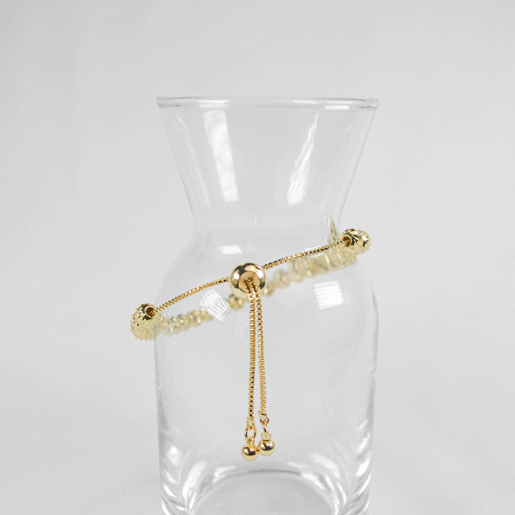 La pulsera de bolitas brillantes Cir Gold es una delicada pieza de joyería que presenta una cadena adornada con pequeñas bolitas que brillan con luz propia.