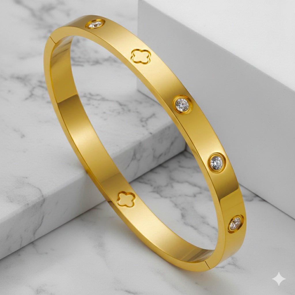 Descubre nuestro hermoso Brazalete Carter trébol, Fabricado en Acero Inoxidable con chapa de oro de 18k de alta calidad.