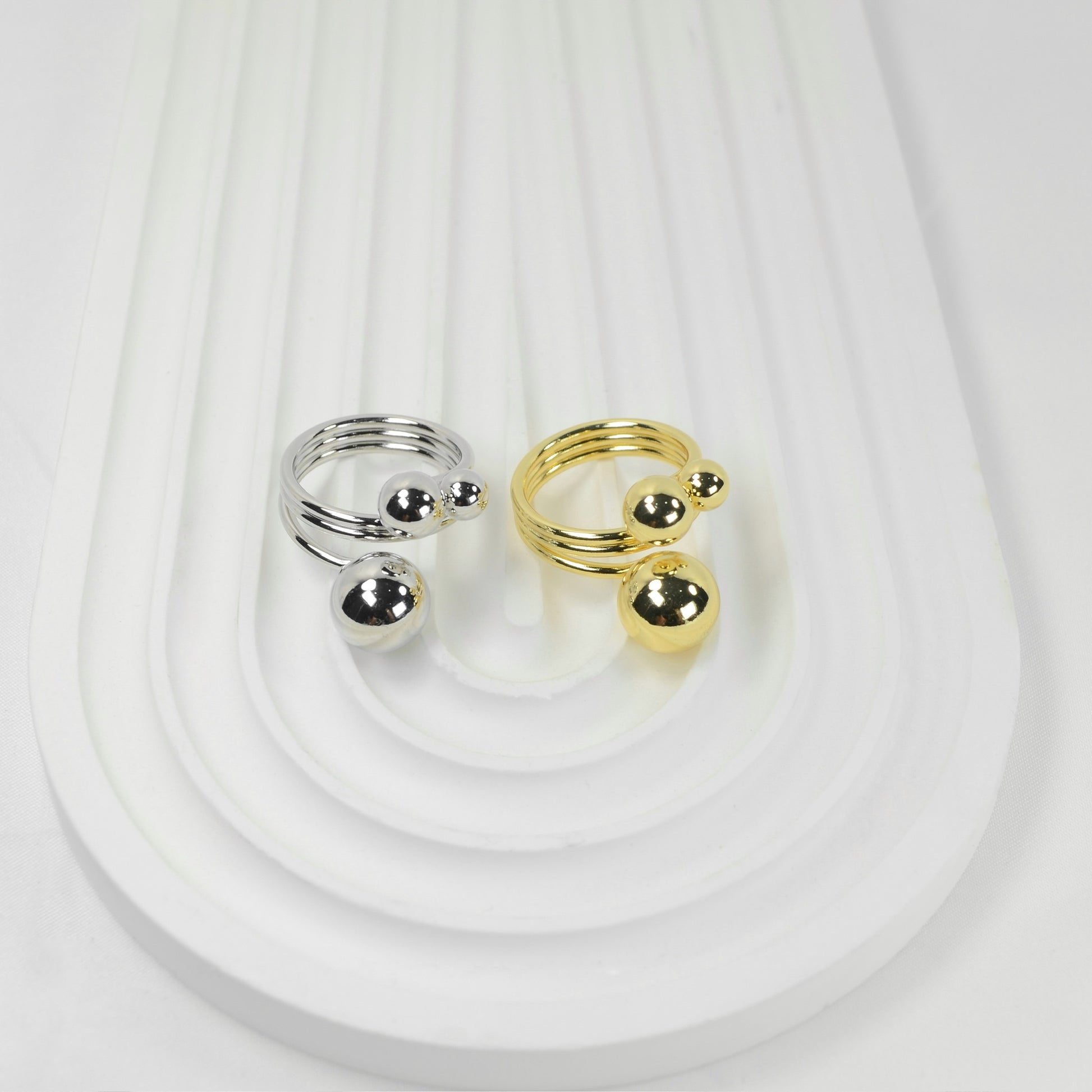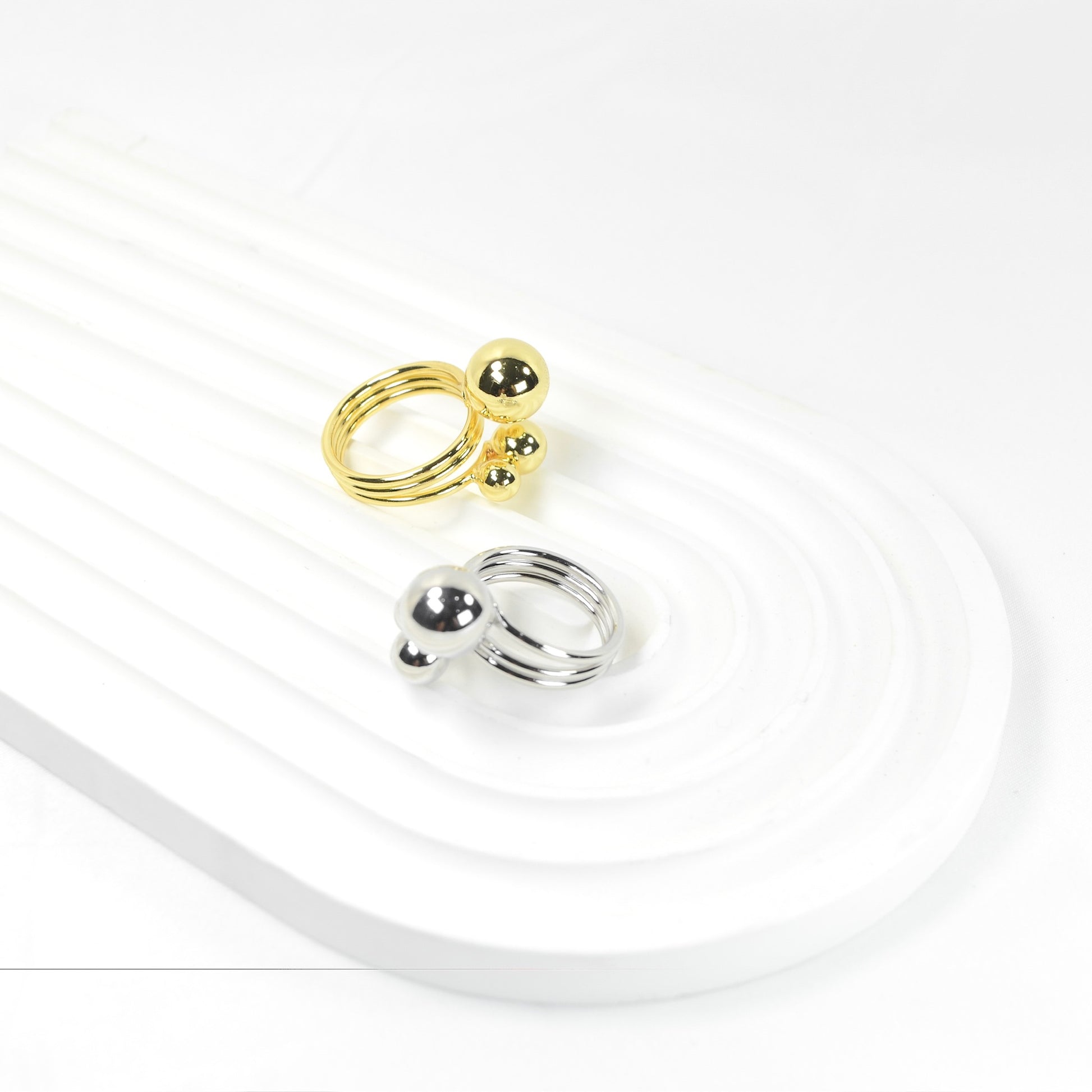 Presentamos nuestro extravagante Triple Ring, un anillo con un diseño distintivo compuesto por tres bolitas, elaborado en acero inoxidable, disponible en Plateado o Chapa de Oro 18k.
